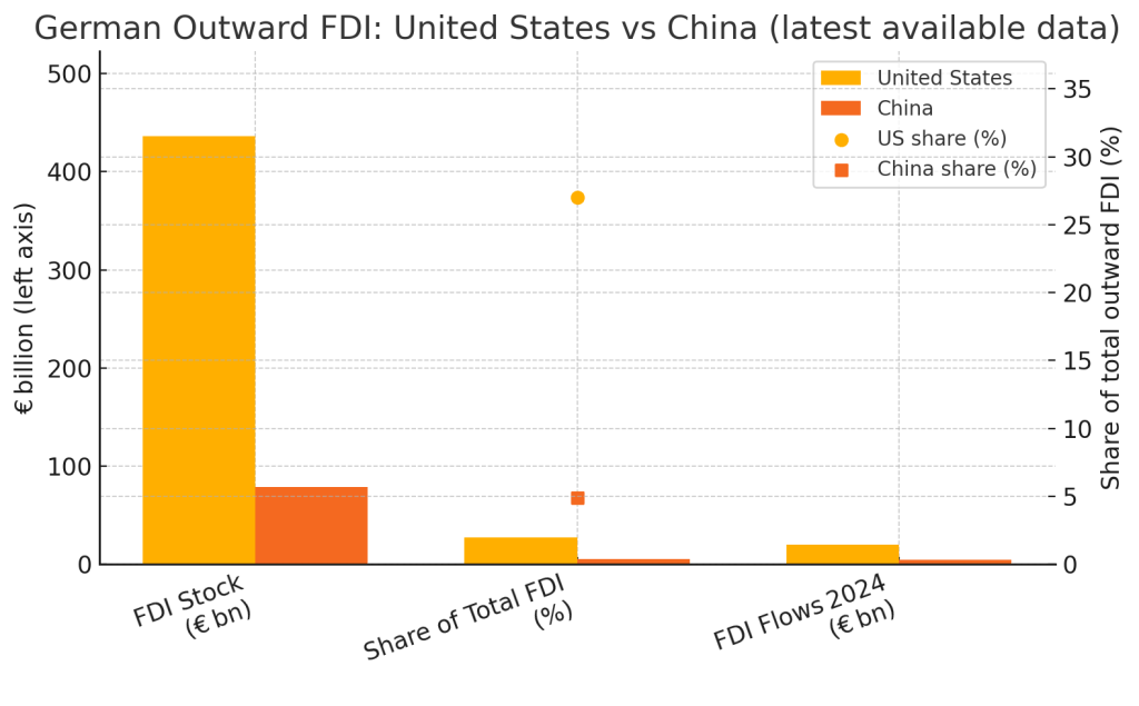 Share of total outward FDI – calculated from the same Bundesbank stock figures: US 27% vs China ≈ 4.9%.
